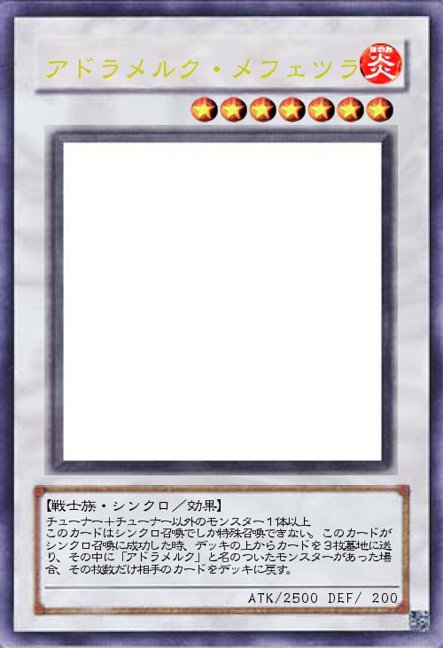 | チューナー+チューナー以外のモンスター1体以上 このカードはシンクロ召喚でしか特殊召喚できない。このカードがシンクロ召喚に成功した時、デッキの上からカードを3枚墓地に送り、その中に「アドラメルク」と名のついたモンスターがあった場合、その枚数だけ相手のカードをデッキに戻す。 | |||