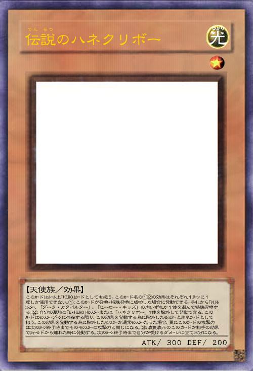 | このカードはルール上「HERO」カードとしても扱う。このカード名の①②の効果はそれぞれ1ターンに1度しか使用できない。①:このカードが召喚・特殊召喚に成功した場合に発動できる。手札から「N」モンスター、「ダーク・カタパルター」、「ヒーロー・キッズ」の内いずれか1体を選んで特殊召喚する。②:自分の墓地の「E・HERO」モンスターまたは「ハネクリボー」1体を除外して発動できる。このカードはモンスターゾーンに存在する限り、この効果を発動する為に除外したモンスターと同名カードとして扱う。この効果を発動する為に除外したモンスターが通常モンスターだった場合、更にこのカードの攻撃力は次のターン終了時までそのモンスターの攻撃力と同じになる。③:表側表示のこのカードが相手の効果でフィールドから離れた時に発動する。次のターン終了時まで自分が受けるダメージは全て半分になる。 | |||