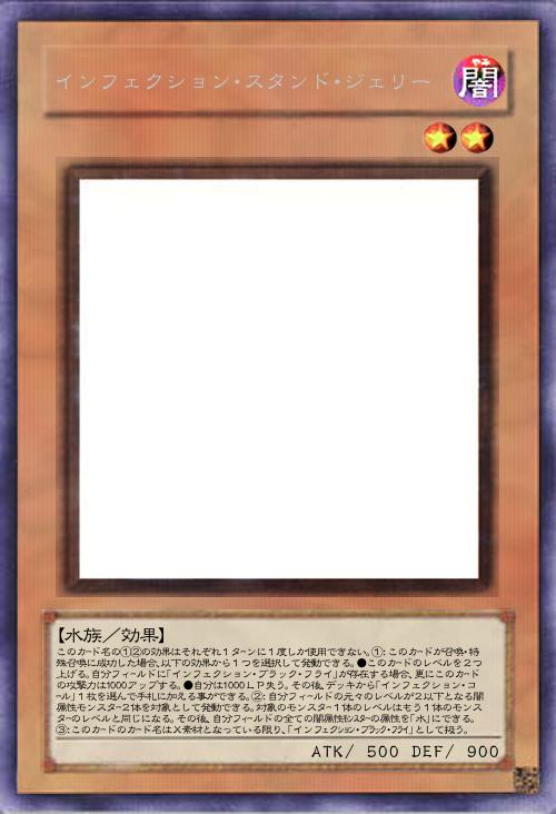 | このカード名の①②の効果はそれぞれ1ターンに1度しか使用できない。①:このカードが召喚・特殊召喚に成功した場合、以下の効果から1つを選択して発動できる。●このカードのレベルを2つ上げる。自分フィールドに「インフェクション・ブラック・フライ」が存在する場合、更にこのカードの攻撃力は1000アップする。●自分は1000LP失う。その後、デッキから「インフェクション・コール」1枚を選んで手札に加える事ができる。②:自分フィールドの元々のレベルが2以下となる闇属性モンスター2体を対象として発動できる。対象のモンスター1体のレベルはもう1体のモンスターのレベルと同じになる。その後、自分フィールドの全ての闇属性モンスターの属性を「水」にできる。③:このカードのカード名はX素材となっている限り、「インフェクション・ブラック・フライ」として扱う。 | |||