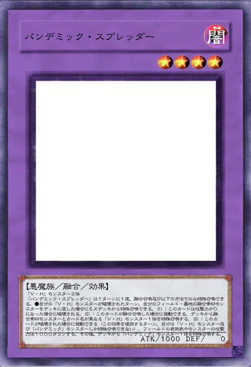 | 「V・H」モンスター2体 「パンデミック・スプレッダー」は1ターンに1度、融合召喚及び以下の方法でのみ特殊召喚できる。●自分の「V・H」モンスターが破壊されたターン、自分のフィールド・墓地の融合素材モンスターをデッキに戻した場合にEXデッキから特殊召喚できる。(1):このカードは攻撃力が0になった場合に破壊される。(2):このカードが融合召喚した場合に発動できる。デッキから融合素材モンスターとカード名が異なる「V・H」モンスター1体を特殊召喚する。(3):このカードが破壊された場合に発動できる(この効果を使用するターン、自分は「V・H」モンスター及び「パンデミック」モンスターしか特殊召喚できない)。フィールドの表側表示モンスターの攻撃力は1000ダウンする。その後、デッキから「パンデミック」モンスター1体を特殊召喚する。 | |||