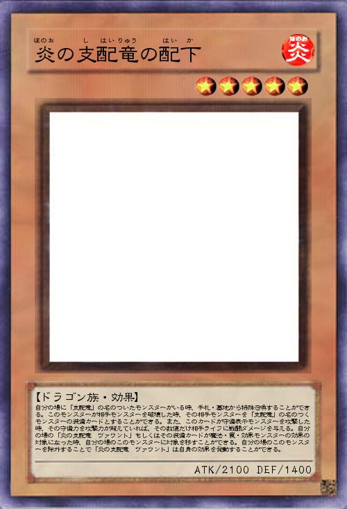 | 自分の場に「支配竜」の名のついたモンスターがいる時、手札・墓地から特殊召喚することができる。このモンスターが相手モンスターを破壊した時、その相手モンスターを「支配竜」の名のつくモンスターの装備カードとすることができる。また、このカードが守備表示モンスターを攻撃した時、その守備力を攻撃力が超えていれば、その数値だけ相手ライフに戦闘ダメージを与える。自分の場の「炎の支配竜 ヴァウント」もしくはその装備カードが魔法・罠・効果モンスターの効果の対象になった時、自分の場のこのモンスターに対象を移すことができる。自分の場のこのモンスターを除外することで「炎の支配竜 ヴァウント」は自身の効果を発動することができる。 | |||