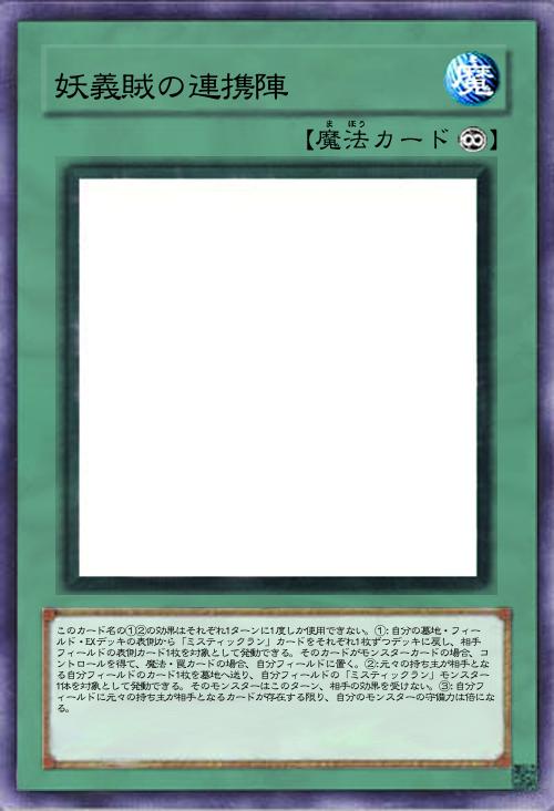 | このカード名の①②の効果はそれぞれ1ターンに1度しか使用できない。①:自分の墓地・フィールド・EXデッキの表側から「ミスティックラン」カードをそれぞれ1枚ずつデッキに戻し、相手フィールドの表側カード1枚を対象として発動できる。そのカードがモンスターカードの場合、コントロールを得て、魔法・罠カードの場合、自分フィールドに置く。②:元々の持ち主が相手となる自分フィールドのカード1枚を墓地へ送り、自分フィールドの「ミスティックラン」モンスター1体を対象として発動できる。そのモンスターはこのターン、相手の効果を受けない。③:自分フィールドに元々の持ち主が相手となるカードが存在する限り、自分のモンスターの守備力は倍になる。 | |||