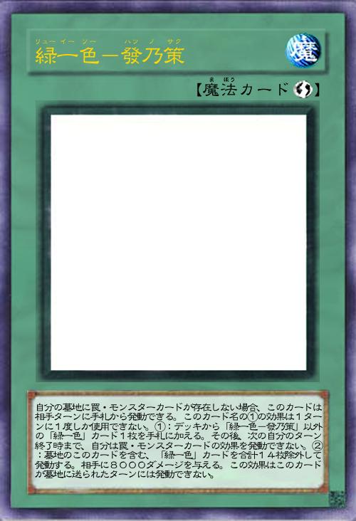 | 自分の墓地に罠・モンスターカードが存在しない場合、このカードは相手ターンに手札から発動できる。このカード名の①の効果は1ターンに1度しか使用できない。①:デッキから「緑一色-發乃策」以外の「緑一色」カード1枚を手札に加える。その後、次の自分のターン終了時まで、自分は罠・モンスターカードの効果を発動できない。②:墓地のこのカードを含む、「緑一色」カードを合計14枚除外して発動する。相手に8000ダメージを与える。この効果はこのカードが墓地に送られたターンには発動できない。 | |||
