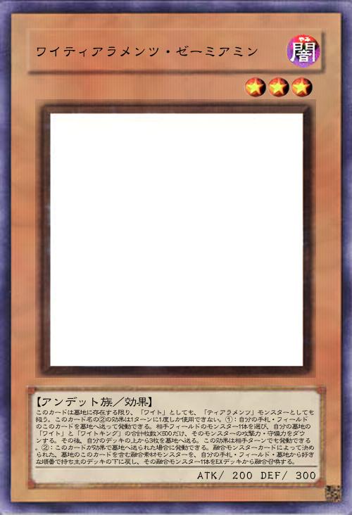 | このカードは墓地に存在する限り、「ワイト」としても、「ティアラメンツ」モンスターとしても扱う。このカード名の②の効果は1ターンに1度しか使用できない。①:自分の手札・フィールドのこのカードを墓地へ送って発動できる。相手フィールドのモンスター1体を選び、自分の墓地の「ワイト」と「ワイトキング」の合計枚数×500だけ、そのモンスターの攻撃力・守備力をダウンする。その後、自分のデッキの上から3枚を墓地へ送る。この効果は相手ターンでも発動できる。②:このカードが効果で墓地へ送られた場合に発動できる。融合モンスターカードによって決められた、墓地のこのカードを含む融合素材モンスターを、自分の手札・フィールド・墓地から好きな順番で持ち主のデッキの下に戻し、その融合モンスター1体をEXデッキから融合召喚する。 | |||
