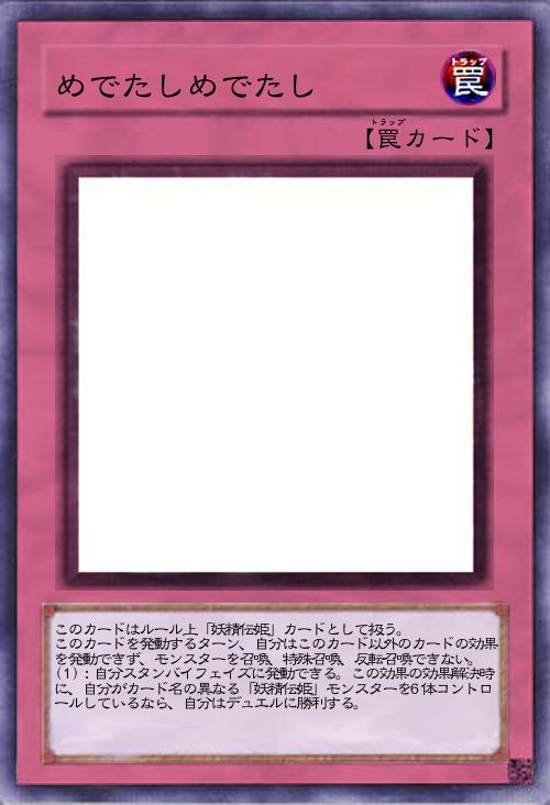 | このカードはルール上「妖精伝姫」カードとして扱う。 このカードを発動するターン、自分はこのカード以外のカードの効果を発動できず、モンスターを召喚、特殊召喚、反転召喚できない。 (1):自分スタンバイフェイズに発動できる。この効果の効果解決時に、自分がカード名の異なる「妖精伝姫」モンスターを6体コントロールしているなら、自分はデュエルに勝利する。 | |||