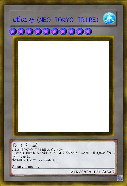 | NEO TOKYO TRIBEのメンバー これが召喚されると強制でビールを飲むことになり、掛け声は「うにゃ」になる。 髪型はツインテールのみになる。 @panyafamily | |||