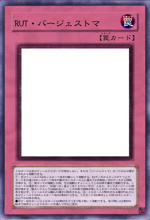 | このカードは自分フィールドにカードが存在しない、または「バージェストマ」カードのみの場合に手札から発動できる。 ①:自分フィールドのXモンスター1体を対象にして発動する。EXデッキからランクが1つ上でカード名の違うXモンスター1体を対象のモンスターの上に重ねてX召喚扱いでEXデッキから特殊召喚する。②:罠カードが発動した時、その発動にチェーンしてこの効果を墓地で発動できる。このカードは通常モンスター(水族・水・星2・攻1200/守0)となり、モンスターゾーンに特殊召喚する(罠カードとしては扱わない)。この効果で特殊召喚したこのカードはモンスターの効果を受けず、フィールドから離れた場合に除外される。③:このカードが除外される場合代わりに自分フィールドのXモンスター1体のX素材にできる。このカードをX素材として持つXモンスターは以下の効果を得る。 ●自分・相手ターンにこのカードのX素材を3つまで取り除いて発動できる。取り除いたX素材の数まで相手フィールドのカードを選んで手札に戻す。 | |||