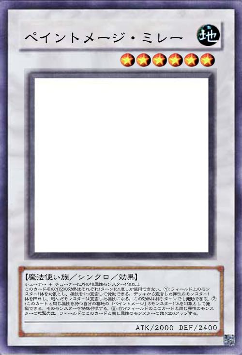 | チューナー + チューナー以外の地属性モンスター1体以上 このカード名の①②の効果はそれぞれ1ターンに1度しか使用できない。①:フィールド上のモンスター1体を対象とし、属性を1つ宣言して発動できる。デッキから宣言した属性のモンスター1体を除外し、選んだモンスターは宣言した属性になる。この効果は相手ターンでも発動できる。②:このカードと同じ属性を持つ自分の墓地の「ペイントメージ」Sモンスター1体を対象として発動できる。そのモンスターを特殊召喚する。③:自分フィールドのこのカードと同じ属性のモンスターの攻撃力は、フィールドのこのカードと同じ属性のモンスターの数×200アップする。 | |||