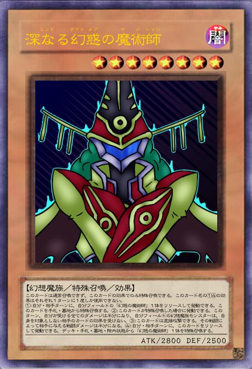 | このカードは通常召喚できず、このカードの効果でのみ特殊召喚できる。このカード名の①④の効果はそれぞれ1ターンに1度しか使用できない。 ①:自分・相手ターンに、自分フィールドの「幻惑の魔術師」1体をリリースして発動できる。このカードを手札・墓地から特殊召喚する。②:このカードが特殊召喚した場合に発動できる。このターン、自分が受ける全てのダメージは半分になり、自分フィールドの幻想魔族モンスターは、自身を対象としない相手のカードの効果を受けない。③:このカードは直接攻撃できる。その戦闘によって相手に与える戦闘ダメージは半分になる。④:自分・相手ターンに、このカードをリリースして発動できる。デッキ・手札・墓地・除外状態から「幻惑の魔術師」1体を特殊召喚する。 | |||