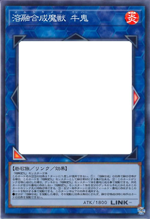 | 「熔解変化」モンスター2体 このカード名の②③の効果は1ターンに1度しか使用できない。①:「溶融合成」の効果で融合召喚する場合、このカードを「熔解変化」モンスターとして融合素材にする事が出来る。②:このカードがリンク召喚に成功した場合、デッキから「熔解変化」モンスター1体を墓地に送る事で発動できる。同名カードが自分の墓地に存在しない「熔解変化」モンスター1体を自分のデッキから手札に加えるかこのカードのリンク先に特殊召喚できる。③:自分・相手ターンに自分のフィールド・墓地に存在するこのカードを除外する事で発動できる。このターン中以下の効果を適用する。 ●自分が「溶融合成」を発動した場合、その発動と効果は無効にされず、融合召喚成功時に相手はカードの効果を発動できない。 | |||