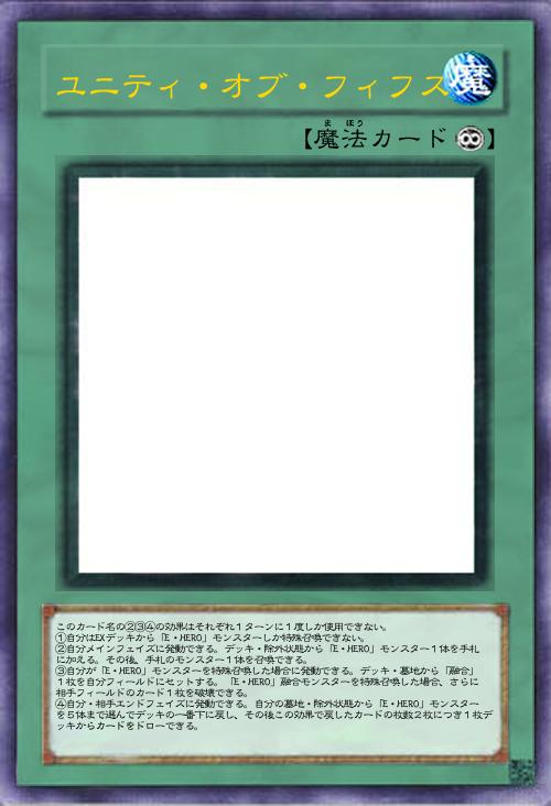 | このカード名の②③④の効果はそれぞれ1ターンに1度しか使用できない。 ①自分はEXデッキから「E・HERO」モンスターしか特殊召喚できない。 ②自分メインフェイズに発動できる。デッキ・除外状態から「E・HERO」モンスター1体を手札に加える。その後、手札のモンスター1体を召喚できる。 ③自分が「E・HERO」モンスターを特殊召喚した場合に発動できる。デッキ・墓地から「融合」1枚を自分フィールドにセットする。「E・HERO」融合モンスターを特殊召喚した場合、さらに相手フィールドのカード1枚を破壊できる。 ④自分・相手エンドフェイズに発動できる。自分の墓地・除外状態から「E・HERO」モンスターを5体まで選んでデッキの一番下に戻し、その後この効果で戻したカードの枚数2枚につき1枚デッキからカードをドローできる。 | |||