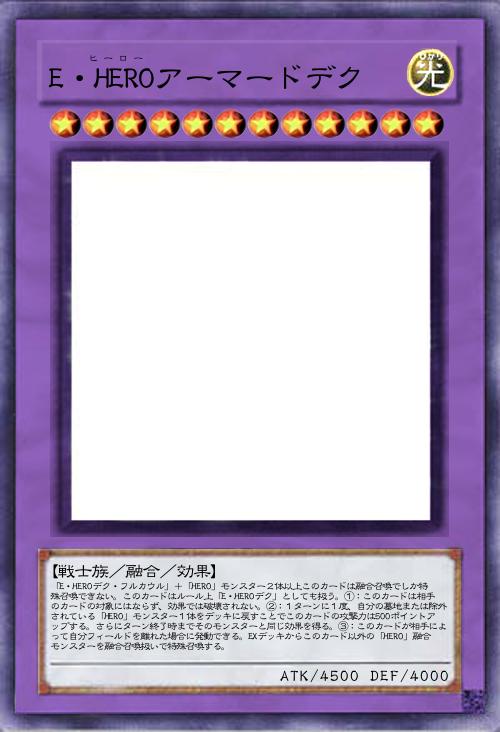 | 「E・HEROデク・フルカウル」+「HERO」モンスター2体以上このカードは融合召喚でしか特殊召喚できない。このカードはルール上「E・HEROデク」としても扱う。①:このカードは相手のカードの対象にはならず、効果では破壊されない。②:1ターンに1度、自分の墓地または除外されている「HERO」モンスター1体をデッキに戻すことでこのカードの攻撃力は500ポイントアップする。さらにターン終了時までそのモンスターと同じ効果を得る。③:このカードが相手によって自分フィールドを離れた場合に発動できる。EXデッキからこのカード以外の「HERO」融合モンスターを融合召喚扱いで特殊召喚する。 | |||