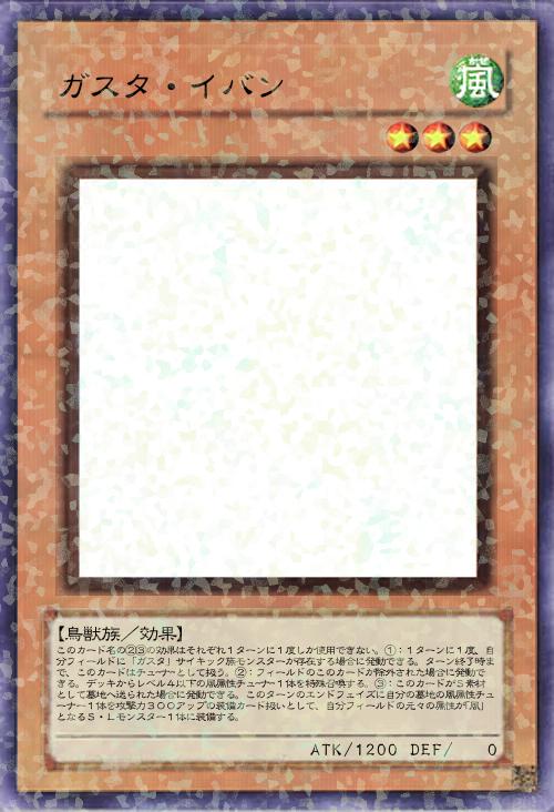 | このカード名の②③の効果はそれぞれ1ターンに1度しか使用できない。①:1ターンに1度、自分フィールドに「ガスタ」サイキック族モンスターが存在する場合に発動できる。ターン終了時まで、このカードはチューナーとして扱う。②:フィールドのこのカードが除外された場合に発動できる。デッキからレベル4以下の風属性チューナー1体を特殊召喚する。③:このカードがS素材として墓地へ送られた場合に発動できる。このターンのエンドフェイズに自分の墓地の風属性チューナー1体を攻撃力300アップの装備カード扱いとして、自分フィールドの元々の属性が「風」となるS・Lモンスター1体に装備する。 | |||