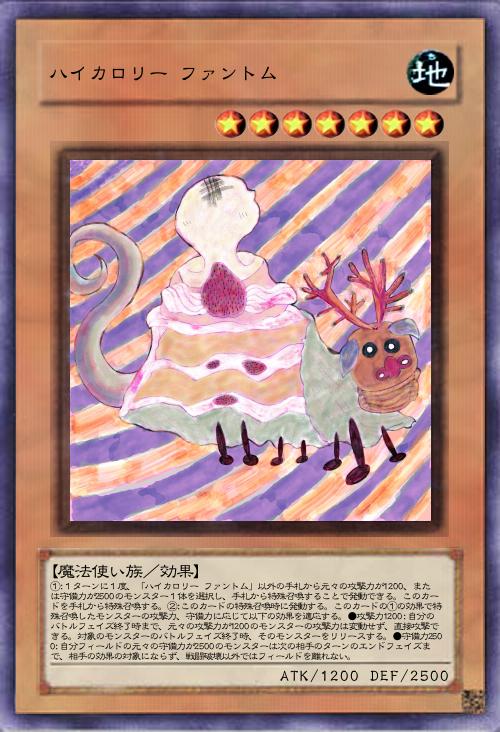 | ①:1ターンに1度、「ハイカロリー ファントム」以外の手札から元々の攻撃力が1200、または守備力が2500のモンスター1体を選択し、手札から特殊召喚することで発動できる。このカードを手札から特殊召喚する。②:このカードの特殊召喚時に発動する。このカードの①の効果で特殊召喚したモンスターの攻撃力、守備力に応じて以下の効果を適応する。●攻撃力1200:自分のバトルフェイズ終了時まで、元々の攻撃力が1200のモンスターの攻撃力は変動せず、直接攻撃できる。対象のモンスターのバトルフェイズ終了時、そのモンスターをリリースする。●守備力2500:自分フィールドの元々の守備力が2500のモンスターは次の相手のターンのエンドフェイズまで、相手の効果の対象にならず、戦闘破壊以外ではフィールドを離れない。 | |||