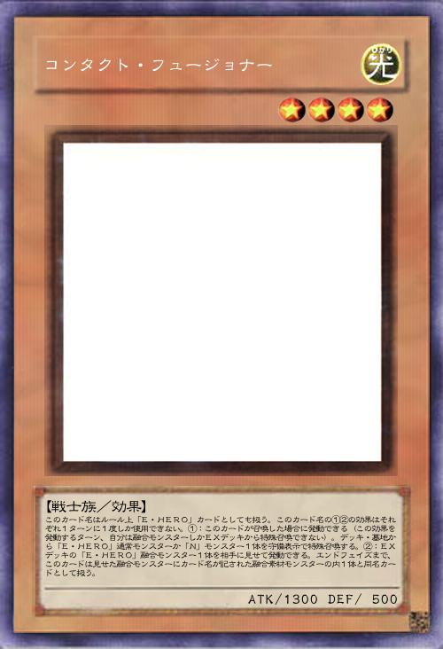 | このカード名はルール上「E・HERO」カードとしても扱う。このカード名の①②の効果はそれぞれ1ターンに1度しか使用できない。①:このカードが召喚した場合に発動できる(この効果を発動するターン、自分は融合モンスターしかEXデッキから特殊召喚できない)。デッキ・墓地から「E・HERO」通常モンスターか「N」モンスター1体を守備表示で特殊召喚する。②:EXデッキの「E・HERO」融合モンスター1体を相手に見せて発動できる。エンドフェイズまで、このカードは見せた融合モンスターにカード名が記された融合素材モンスターの内1体と同名カードとして扱う。 | |||