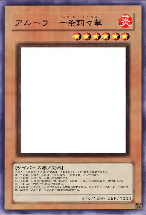 | このカード名の(2)から(4)の効果は、それぞれ1ターンに1度しか発動できない。 (1):このカードのカード名は、「ReGLOSS-一条莉々華」としても扱う。 (2):このカードはリリース無しで召喚できる。 (3):このカードの(2)の効果で召喚した場合、このカードのレベルは3になり、自分は「アルーラ」モンスター1体を手札から召喚できる。 (4):このカードがアドバンス召喚している場合に発動できる。デッキから「アルーラ-一条莉々華」以外の「アルーラ」モンスター1体を特殊召喚する。 | |||