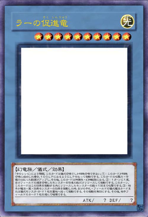 | 「古のレシピ」により降臨。このカードは儀式召喚でしか特殊召喚できない。①:このカードが特殊召喚に成功した場合、100LPになるようにLPを払って発動できる。このカードの攻撃力・守備力は払った数値分アップし、その後、このカードは神属性・幻神獣族になる。②:1ターンに1度、自分フィールドの通常召喚したモンスターを任意の数だけリリースして発動できる。このターン、このカードはこの効果を発動する為にリリースしたモンスターの数+1回まで攻撃できる。③:相手が魔法・罠・効果モンスターの効果を発動した時、自分の手札・フィールドの儀式魔法カードまたは儀式モンスターカード1枚を墓地へ送って発動できる。その発動を無効にする。その後、相手フィールドのカード1枚を選んで破壊できる。 | |||
