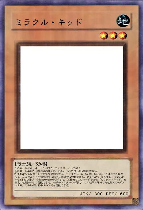 | このカードはルール上「E・HERO」モンスターとして扱う。 このカード名の①②③の効果はそれぞれ1ターンに1度しか発動できない。 ①手札からこのカードを捨てて発動できる。デッキから「E・HERO」モンスター1体を手札に加える。②このカードが特殊召喚に成功した場合に発動できる。デッキから「E・HERO」モンスターを2体まで選び、守備表示で特殊召喚する。③墓地のこのカードを含む「ミラクル・キッド」を任意の枚数除外して発動できる。相手モンスターの攻撃力はこの効果で除外した枚数×400ダウンする。この効果は相手ターンでも発動できる。 | |||