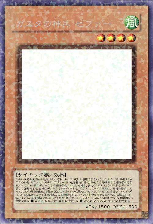 | このカード名の②③④の効果はそれぞれ1ターンに1度しか使用できない。①:このカードは手札の「ガスタの神兵 ゼファー」以外の「ガスタ」カード1枚を墓地に捨て、手札から守備表示で特殊召喚できる。②:このカードがデッキからの特殊召喚に成功した場合、手札の「ガスタ」カード1枚をデッキに戻して発動できる。自分はデッキから1枚ドローする。「ガスタ」カードの効果による特殊召喚によって、この効果を発動した場合、更にこのカードの攻撃力は400アップする。③:自分フィールドの「ガスタ」鳥獣族モンスター1体を対象として発動できる。ターン終了時までそのモンスターは、攻撃力が1500アップし、直接攻撃できない。④:自分・相手のバトルフェイズに以下の効果から1つを選択して発動できる。●「ガスタ」Sモンスター1体をS召喚する。●「ガスタ」Xモンスター1体をⅩ召喚する。 | |||