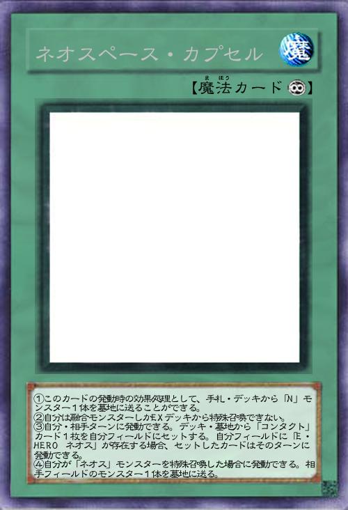 | ①このカードの発動時の効果処理として、手札・デッキから「N」モンスター1体を墓地に送ることができる。 ②自分は融合モンスターしかEXデッキから特殊召喚できない。 ③自分・相手ターンに発動できる。デッキ・墓地から「コンタクト」カード1枚を自分フィールドにセットする。自分フィールドに「E・HERO ネオス」が存在する場合、セットしたカードはそのターンに発動できる。 ④自分が「ネオス」モンスターを特殊召喚した場合に発動できる。相手フィールドのモンスター1体を墓地に送る。 | |||