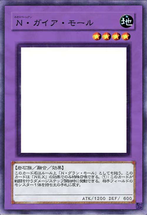 | このカード名はルール上「N・グラン・モール」としても扱う。このカードは「NEX」の効果でのみ特殊召喚できる。①:このカードが戦闘を行うダメージステップ開始時に発動できる。相手フィールドのモンスター1体を持ち主の手札に戻す。 | |||