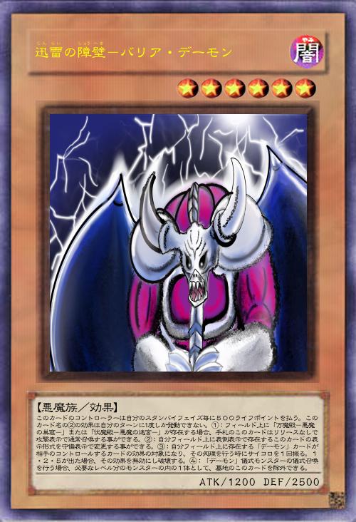 | このカードのコントローラーは自分のスタンバイフェイズ毎に500ライフポイントを払う。このカード名の②の効果は自分のターンに1度しか発動できない。①:フィールド上に「万魔殿-悪魔の巣窟-」または「伏魔殿-悪魔の迷宮-」が存在する場合、手札のこのカードはリリースなしで攻撃表示で通常召喚する事ができる。②:自分フィールド上に表側表示で存在するこのカードの表示形式を守備表示で変更する事ができる。③:自分フィールド上に存在する「デーモン」カードが相手のコントロールするカードの効果の対象になり、その処理を行う時にサイコロを1回振る。1・2・5が出た場合、その効果を無効にし破壊する。④:「デーモン」儀式モンスターの儀式召喚を行う場合、必要なレベル分のモンスターの内の1体として、墓地のこのカードを除外できる。 | |||
