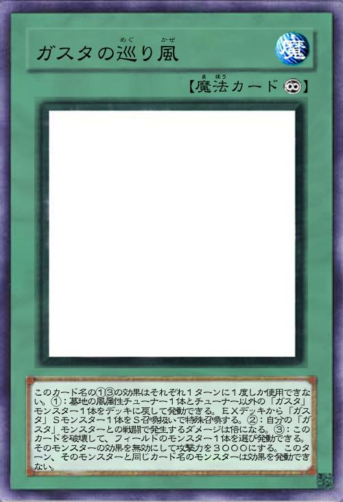 | このカード名の①③の効果はそれぞれ1ターンに1度しか使用できない。①:墓地の風属性チューナー1体とチューナー以外の「ガスタ」モンスター1体をデッキに戻して発動できる。EXデッキから「ガスタ」Sモンスター1体をS召喚扱いで特殊召喚する。②:自分の「ガスタ」モンスターとの戦闘で発生するダメージは倍になる。③:このカードを破壊して、フィールドのモンスター1体を選び発動できる。そのモンスターの効果を無効にして攻撃力を3000にする。このターン、そのモンスターと同じカード名のモンスターは効果を発動できない。 | |||