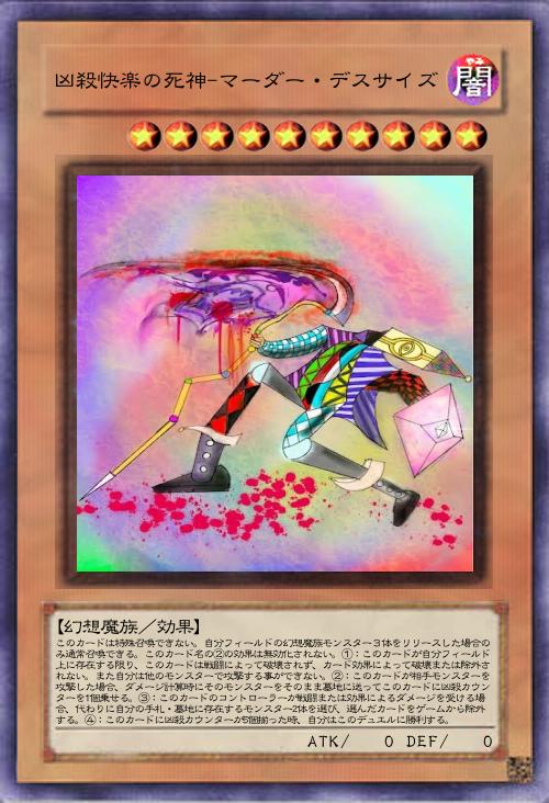 ですのでステータスも攻守ともに0ですが幻想魔族でも切り札とも言える強さで、相手モンスターを戦闘で攻撃して効果でそのまま墓地に送る度に凶殺カウンターとも呼ばれる凶悪な者が乗り、それが5つ揃えば確実な勝利を得る特殊勝利系モンスターにしました。