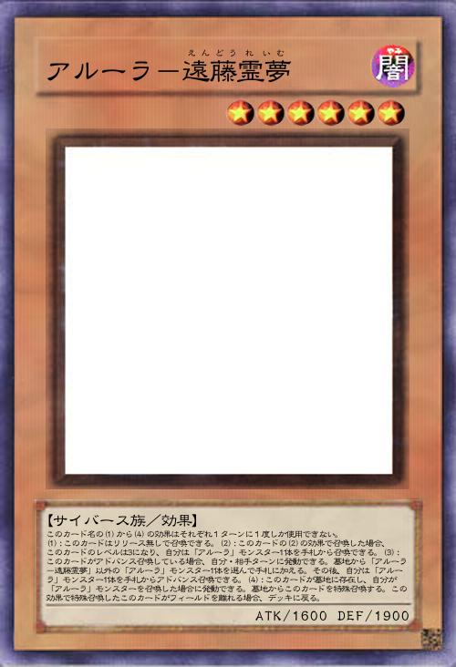 | このカード名の(1)から(4)の効果はそれぞれ1ターンに1度しか使用できない。 (1):このカードはリリース無しで召喚できる。(2):このカードの(2)の効果で召喚した場合、このカードのレベルは3になり、自分は「アルーラ」モンスター1体を手札から召喚できる。(3):このカードがアドバンス召喚している場合、自分・相手ターンに発動できる。墓地から「アルーラ-遠藤霊夢」以外の「アルーラ」モンスター1体を選んで手札に加える。その後、自分は「アルーラ」モンスター1体を手札からアドバンス召喚できる。(4):このカードが墓地に存在し、自分が「アルーラ」モンスターを召喚した場合に発動できる。墓地からこのカードを特殊召喚する。この効果で特殊召喚したこのカードがフィールドを離れる場合、デッキに戻る。 | |||