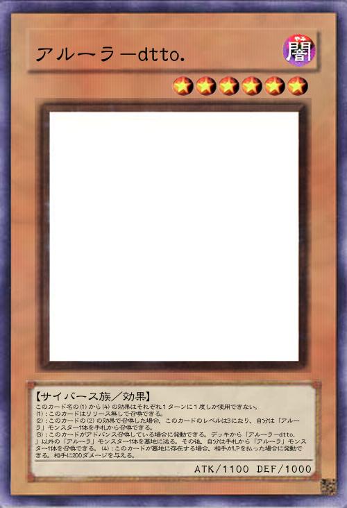 | このカード名の(1)から(4)の効果はそれぞれ1ターンに1度しか使用できない。 (1):このカードはリリース無しで召喚できる。 (2):このカードの(2)の効果で召喚した場合、このカードのレベルは3になり、自分は「アルーラ」モンスター1体を手札から召喚できる。 (3):このカードがアドバンス召喚している場合に発動できる。デッキから「アルーラ-dtto.」以外の「アルーラ」モンスター1体を墓地に送る。その後、自分は手札から「アルーラ」モンスター1体を召喚できる。(4):このカードが墓地に存在する場合、相手がLPを払った場合に発動できる。相手に200ダメージを与える。 | |||