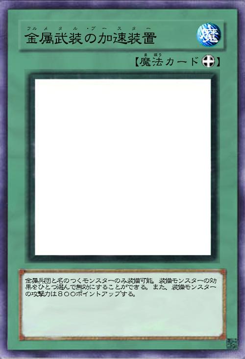 | 金属兵団と名のつくモンスターのみ装備可能。装備モンスターの効果をひとつ選んで無効にすることができる。また、装備モンスターの攻撃力は800ポイントアップする。 | |||