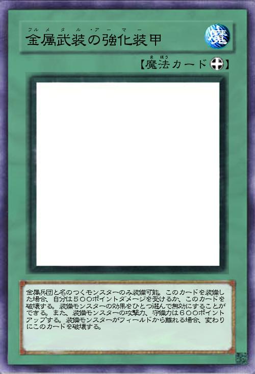 | 金属兵団と名のつくモンスターのみ装備可能。このカードを装備した場合、自分は500ポイントダメージを受けるか、このカードを破壊する。装備モンスターの効果をひとつ選んで無効にすることができる。また、装備モンスターの攻撃力、守備力は600ポイントアップする。装備モンスターがフィールドから離れる場合、変わりにこのカードを破壊する。 | |||