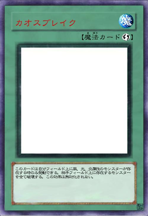 | このカードは自分フィールド上に風、光、炎属性のモンスターが存在する時のみ発動できる。相手フィールド上に存在するモンスターを全て破壊する。この効果は無効化されない。 | |||