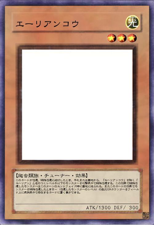 | このカードが召還、特殊召還に成功したとき、手札または墓地から、「エーリアンコウ」を除く「エーリアン」と名のつくレベル5以下のモンスターを攻撃表示で特殊召還する。この効果で特殊召還したモンスターはこのターンのエンドフェイズ時に墓地に送られる。またこのカードの効果でモンスターを特殊召還したとき5-(召還したモンスターのレベル)の数だけAカウンターをフィールド上に表側表示で存在するカードに置く事ができる。 | |||