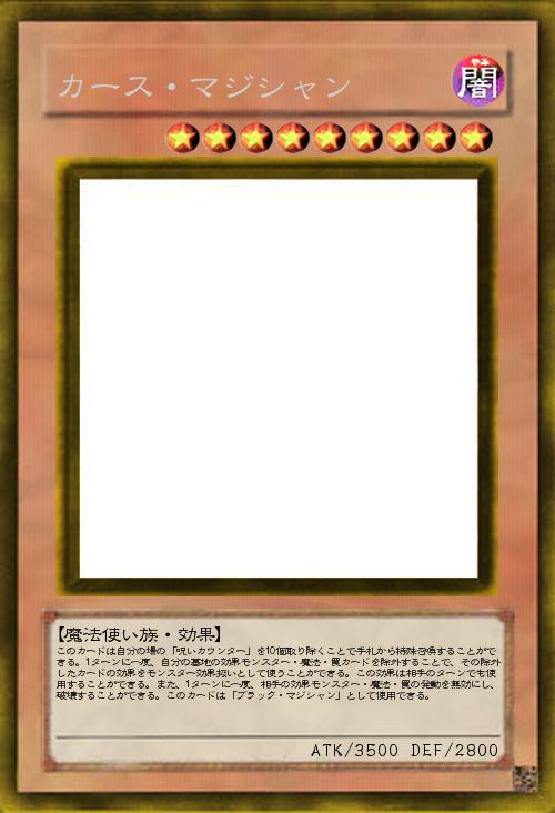 | このカードは自分の場の「呪いカウンター」を10個取り除くことで手札から特殊召喚することができる。1ターンに一度、自分の墓地の効果モンスター・魔法・罠カードを除外することで、その除外したカードの効果をモンスター効果扱いとして使うことができる。この効果は相手のターンでも使用することができる。また、1ターンに一度、相手の効果モンスター・魔法・罠の発動を無効にし、破壊することができる。このカードは「ブラック・マジシャン」として使用できる。 | |||