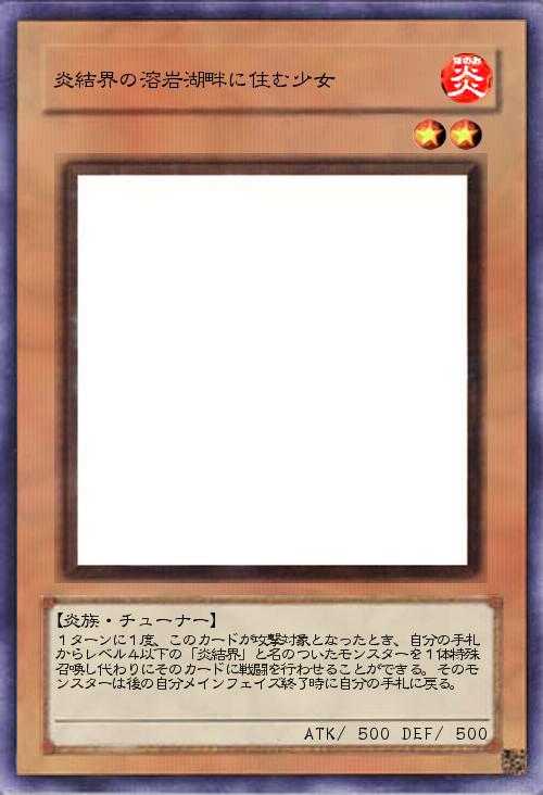 | 1ターンに1度、このカードが攻撃対象となったとき、自分の手札からレベル4以下の「炎結界」と名のついたモンスターを1体特殊召喚し代わりにそのカードに戦闘を行わせることができる。そのモンスターは後の自分メインフェイズ終了時に自分の手札に戻る。 | |||