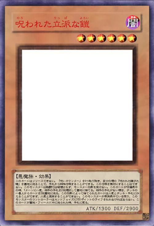 | このカードはリリースできない。「呪いカウンター」を4つ取り除き、自分の場の「呪われた錆びた鎧」を墓地に送ることで、手札から特殊召喚することができる。この召喚を無効にすることはできない。このモンスターは戦闘では破壊されず、モンスター効果も受けない。このカードが守備表示の時、1ターンに一度、相手の手札を2枚選択して墓地に捨てる。相手の手札がない場合、デッキの一番上からカードを2枚墓地に送る。この効果によって捨てられたカードは二度とデッキ・手札に加えることができず、二度と使用することができない。このモンスターが表側表示でいる限り、このモンスターのコントローラーはエンドフェイズに150ポイントのライフを払わなければならない。このカードが墓地・フィールド外に送られた時、手札に戻る。 | |||