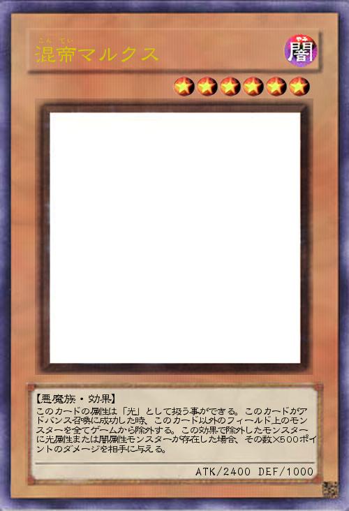 | このカードの属性は「光」として扱う事ができる。このカードがアドバンス召喚に成功した時、このカード以外のフィールド上のモンスターを全てゲームから除外する。この効果で除外したモンスターに光属性または闇属性モンスターが存在した場合、その数×500ポイントのダメージを相手に与える。 | |||