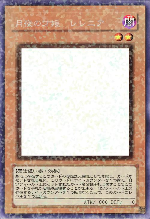 「【セインと共にアルナの腹心であるレレニアはフラウ・ロウに得体の知れない不信感を抱いていた。そこで彼女はアルナには秘密で月夜の精鋭を集める。精鋭たちを前に近いうちに戦争が起きることを名言。さらにフラウ・ロウの策を逆手に取り、人質として引き渡す月夜の巫女を秘密裏に暗殺者へとすりかえて保険を掛けた】月夜は元ネタの常夜と同じく会苦シーズが切り札です。特殊召喚効果とレベル操作能力を持つこのカードは扱いやすいと思います(`・ω・´)」(2012-09-10 18:30)