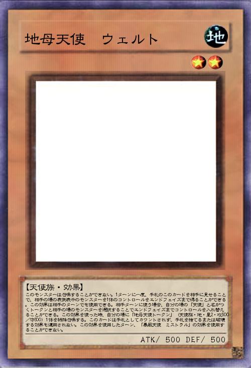 | このモンスターは召喚することができない。1ターンに一度、手札のこのカードを相手に見せることで、相手の場の表側表示のモンスターを1体のコントロールをエンドフェイズまで得ることができる。この効果は相手のターンでも使用できる。相手ターンに使う場合、自分の場の「天使」と名がつくトークンと相手の場のモンスターを選択することでエンドフェイズまでコントロールを入れ替えることができる。この効果を使った時、自分の場に「地母天使トークン」(天使族・地・星2・攻500/守500)1体を特殊召喚する。このカードは手札としてカウントされず、手札を捨てるまたは破壊する効果も適用されない。この効果を使用したターン、「暴風天使 ミストラル」の効果を使用することができない。 | |||