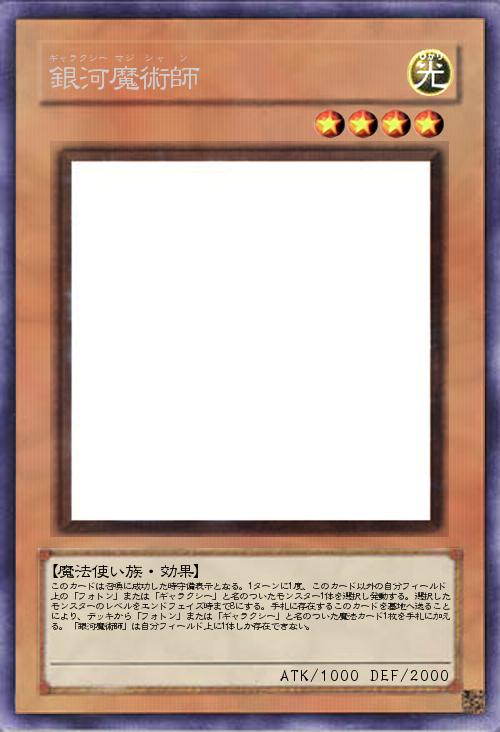 | このカードは召喚に成功した時守備表示となる。1ターンに1度、このカード以外の自分フィールド上の「フォトン」または「ギャラクシー」と名のついたモンスター1体を選択し発動する。選択したモンスターのレベルをエンドフェイズ時まで8にする。手札に存在するこのカードを墓地へ送ることにより、デッキから「フォトン」または「ギャラクシー」と名のついた魔法カード1枚を手札に加える。「銀河魔術師」は自分フィールド上に1体しか存在できない。 | |||