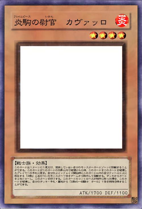 | このカードは1ターンに1度だけ、使用していない自分のモンスターカードゾーンに移動することができる。このカードがこのカードの効果以外で破壊された時、このカードをこのカードを破壊したプレイヤーの手札に戻す。自分のメインフェイズ開始時にこのカード以外の自分フィールド上に存在する「炎駒」と名のついたモンスター1体をゲームから除外して発動する。デッキからカードを2枚ドローし、このターンを終了する。このカードのコントロールが相手に移った場合、このカードを破壊し、自分のデッキ・手札・墓地から「炎駒の一級騎士 オーロ」1体を特殊召喚することができる。 | |||