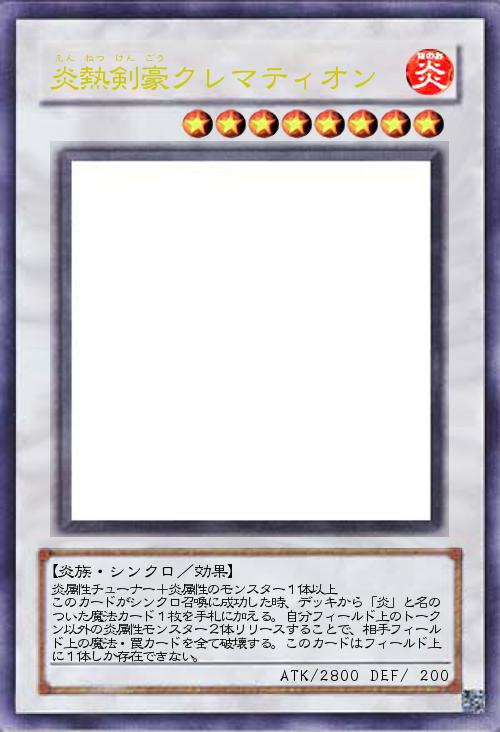 炎属性チューナー+炎属性のモンスター1体以上 このカードがシンクロ召喚に成功した時、デッキから「炎」と名のついた魔法カード1枚を手札に加える。自分フィールド上のトークン以外の炎属性モンスター2体リリースすることで、相手フィールド上の魔法・罠カードを全て破壊する。このカードはフィールド上に1体しか存在できない。 |