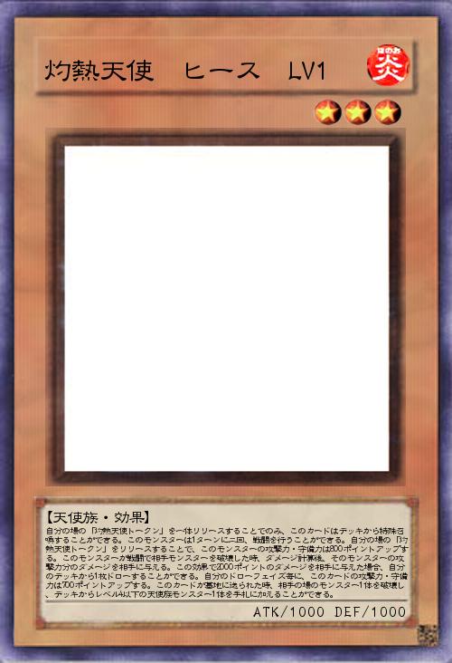 | 自分の場の「灼熱天使トークン」を一体リリースすることでのみ、このカードはデッキから特殊召喚することができる。このモンスターは1ターンに二回、戦闘を行うことができる。自分の場の「灼熱天使トークン」をリリースすることで、このモンスターの攻撃力・守備力は800ポイントアップする。このモンスターが戦闘で相手モンスターを破壊した時、ダメージ計算後、そのモンスターの攻撃力分のダメージを相手に与える。この効果で2000ポイントのダメージを相手に与えた場合、自分のデッキから1枚ドローすることができる。自分のドローフェイズ毎に、このカードの攻撃力・守備力は700ポイントアップする。このカードが墓地に送られた時、相手の場のモンスター1体を破壊し、デッキからレベル4以下の天使族モンスター1体を手札に加えることができる。 | |||