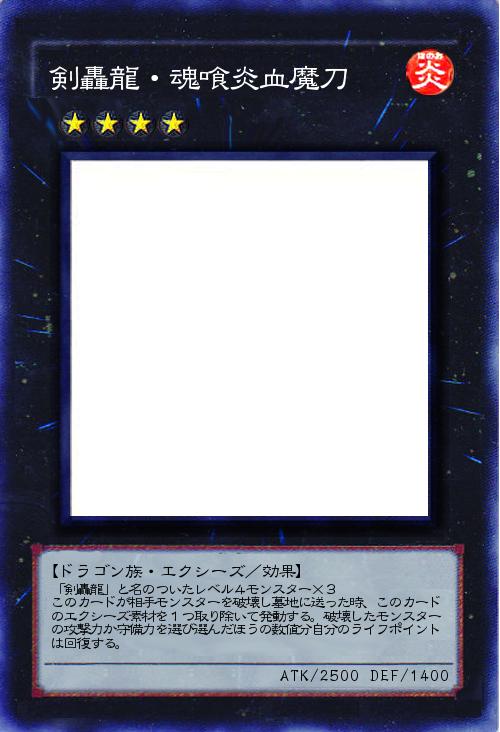 | 「剣轟龍」と名のついたレベル4モンスター×3 このカードが相手モンスターを破壊し墓地に送った時、このカードのエクシーズ素材を1つ取り除いて発動する。破壊したモンスターの攻撃力か守備力を選び選んだほうの数値分自分のライフポイントは回復する。 | |||