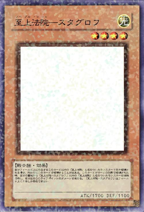 | 自分フィールド上に存在するこのカード以外の「至上法院」と名のついたモンスター1体が破壊される場合、代わりにこのカードを破壊することが出来る。このカードがカードの効果で破壊された時、自分の墓地から「至上法院―スタグロフ」以外の「至上法院」と名のついたモンスターを特殊召喚し、自分は800ライフポイントのダメージを受ける。「至上法院―スタグロフ」はフィールド上に1体しか存在できない | |||