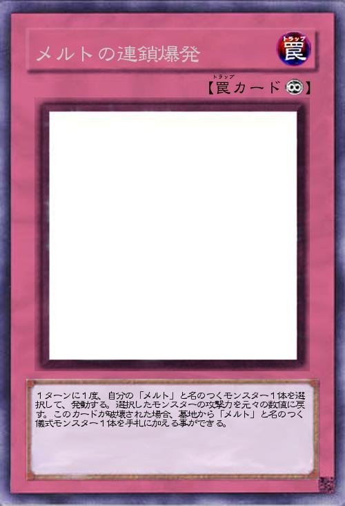 | 1ターンに1度、自分の「メルト」と名のつくモンスター1体を選択して、発動する。選択したモンスターの攻撃力を元々の数値に戻す。このカードが破壊された場合、墓地から「メルト」と名のつく儀式モンスター1体を手札に加える事ができる。 | |||