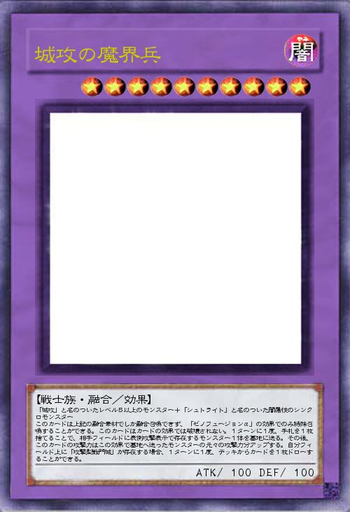 「城攻」と名のついたレベル5以上のモンスター+「シュトライト」と名のついた闇属性のシンクロモンスター このカードは上記の融合素材でしか融合召喚できず、「ゼノフュージョンα」の効果でのみ特殊召喚することができる。このカードはカードの効果では破壊されない。1ターンに1度、手札を1枚捨てることで、相手フィールドに表側攻撃表示で存在するモンスター1体を墓地に送る。その後、このカードの攻撃力はこの効果で墓地へ送ったモンスターの元々の攻撃力分アップする。自分フィールド上に「攻撃型戦門城」が存在する場合、1ターンに1度、デッキからカードを1枚ドローすることができる。 |