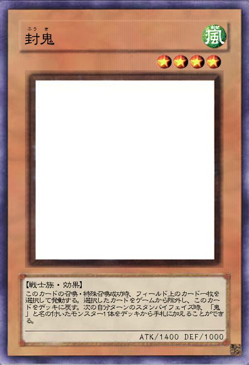 | このカードの召喚・特殊召喚成功時、フィールド上のカード一枚を選択して発動する。選択したカードをゲームから除外し、このカードをデッキに戻す。次の自分ターンのスタンバイフェイズ時、「鬼」と名の付いたモンスター1体をデッキから手札に加えることができる。 | |||