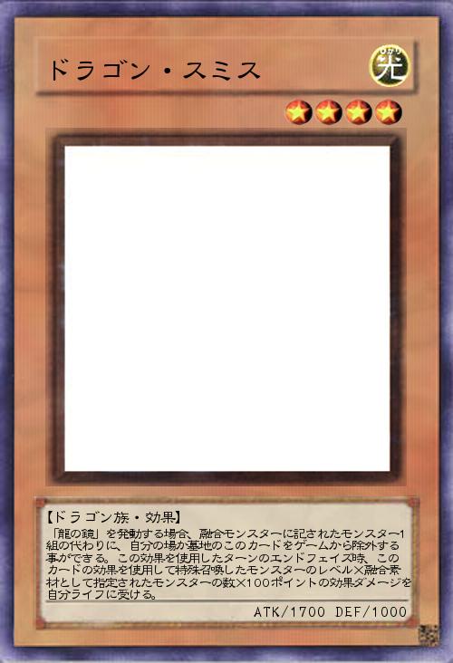 | 「龍の鏡」を発動する場合、融合モンスターに記されたモンスター1組の代わりに、自分の場か墓地のこのカードをゲームから除外する事ができる。この効果を使用したターンのエンドフェイズ時、このカードの効果を使用して特殊召喚したモンスターのレベル×融合素材として指定されたモンスターの数×100ポイントの効果ダメージを自分ライフに受ける。 | |||